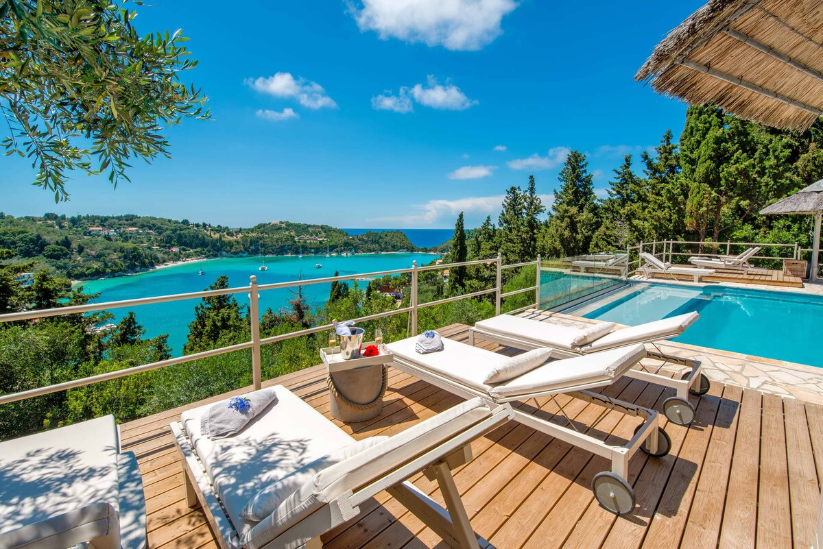 La tenuta di Bigioli è un rifugio di lusso in una valle isolata a nord-ovest di Corfù, situata in una proprietà simile a un parco di 5000 metri quadrati. Comprende un'elegante villa, una pensione e un parco benessere con piscina riscaldata, vasca idromassaggio, sauna e sala fitness. Arredi raffinati, opere d'arte e un campo da basket ne esaltano il fascino. Le spiagge di Agios Georgios, Arillas e San Stefanos distano 5–15 minuti in auto. Un sentiero panoramico tra gli uliveti conduce alla costa, garantendo privacy e tranquillità.