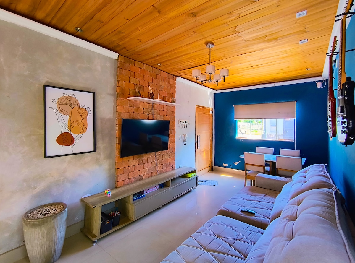 BENVENUTI nella nostra pensione, un ambiente molto tranquillo per soggiornare con la famiglia. Nella casa: - Accoglie fino a 4 persone (2 di loro in letti separati nel soggiorno o su materasso extra in camera da letto) - Aria condizionata SOLO in camera. - Smart TV in salotto -WIFI -ozinha - Garage per 1 auto media (il camion non entra nel garage).