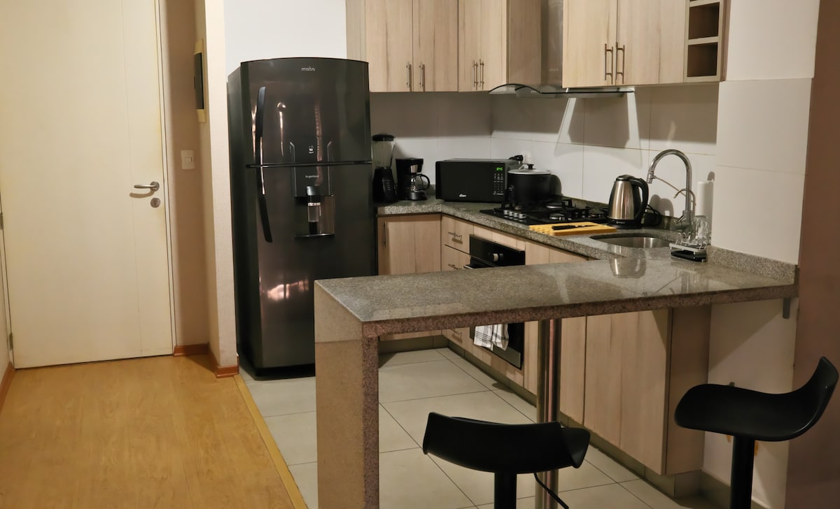 Modern fully furnished apartment, ideal for long stays. Features high-speed Wi-Fi, a 65” Smart TV with Netflix and Disney+, a fully equipped kitchen with espresso machine and water filter, washer-dryer, Double bed, and a balcony. The building offers a swimming pool, gym, and coworking area. 24/7 self check-in, smartkey, free parking, and 24-hour security. Strategically located in San Miguel, close to universities and shopping centers, and less than 20 minutes from the airport.
