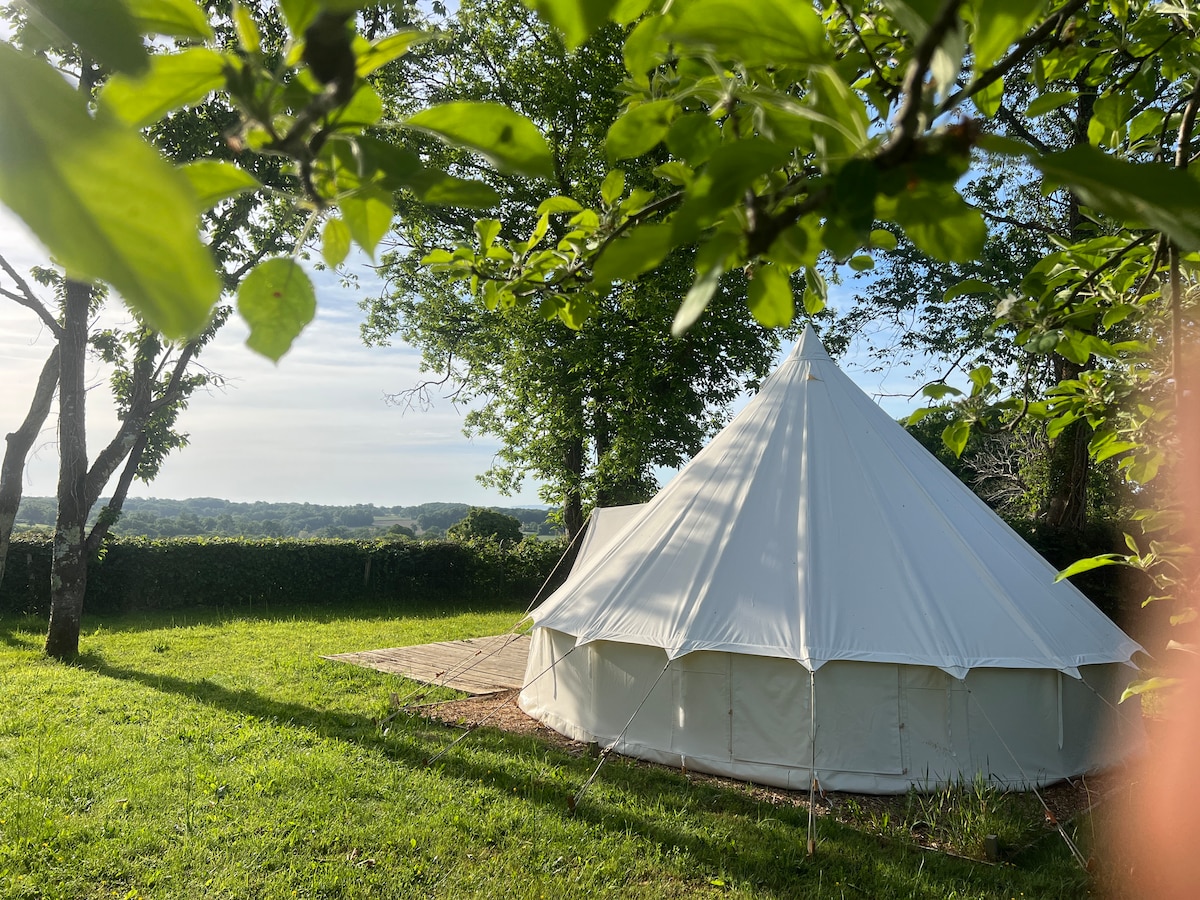 We have 2 lovely glamping tents. You always have the whole site to yourselves and will not share any facilities with other guests. You can book 1 tent (2-3 people), or 2 tents (4-6 people). If you are more than 6, or have questions about children, babies, or anything else, please do contact us, we might be able to help. The tents have countryside views, and are set among fruit trees. You have private access to a full kitchen, bathrooms, swimming pool and undercover relaxing area.