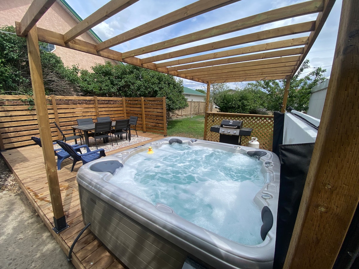 Goditi un'esperienza termale nella nostra casa tranquilla e centrale, vicino a negozi, ristoranti, casinò e pub. Rilassati sulle nostre poltrone in pelle davanti al camino, guarda Netflix o goditi un lussuoso massaggio nella nostra poltrona massaggiante di alta qualità e immergiti nella nostra vasca idromassaggio privata. Viviamo al piano terra, per garantire la tua sicurezza e privacy. Ingresso indipendente e porta con serratura per la privacy tra il piano principale e la zona seminterrato. Abbiamo anche tre bellissime aree salotto all'aperto.