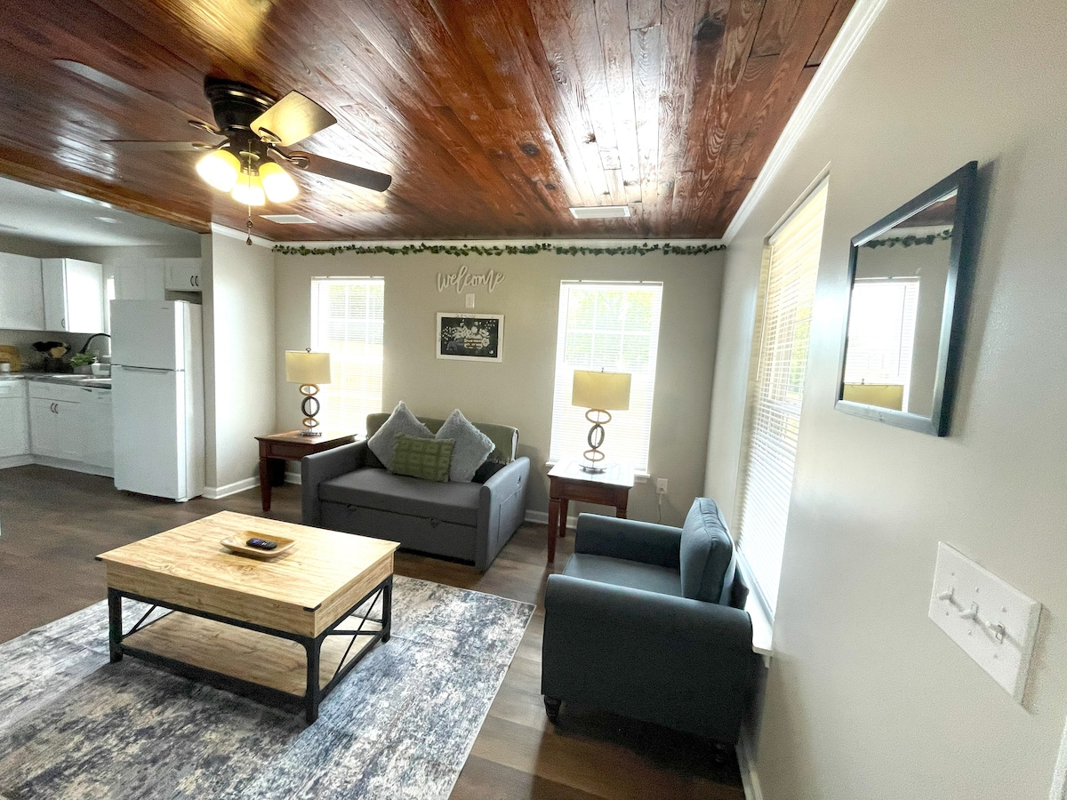 Una vera casa lontano da casa. Questa suite per gli ospiti, splendidamente decorata e arredata, con bagno privato, ingresso e splendido portico anteriore, offre tutto il necessario per rilassarsi durante la visita di Ozark. La suite dispone di pavimenti in legno massello, letto matrimoniale, area salotto con futon, smart TV, bagno completo e angolo cottura completamente attrezzato con frigorifero, forno a microonde, tostapane e macchina da caffè Keurig. La nostra suite per gli ospiti è perfetta per chiunque cerchi un alloggio sicuro e confortevole per godersi la zona.
