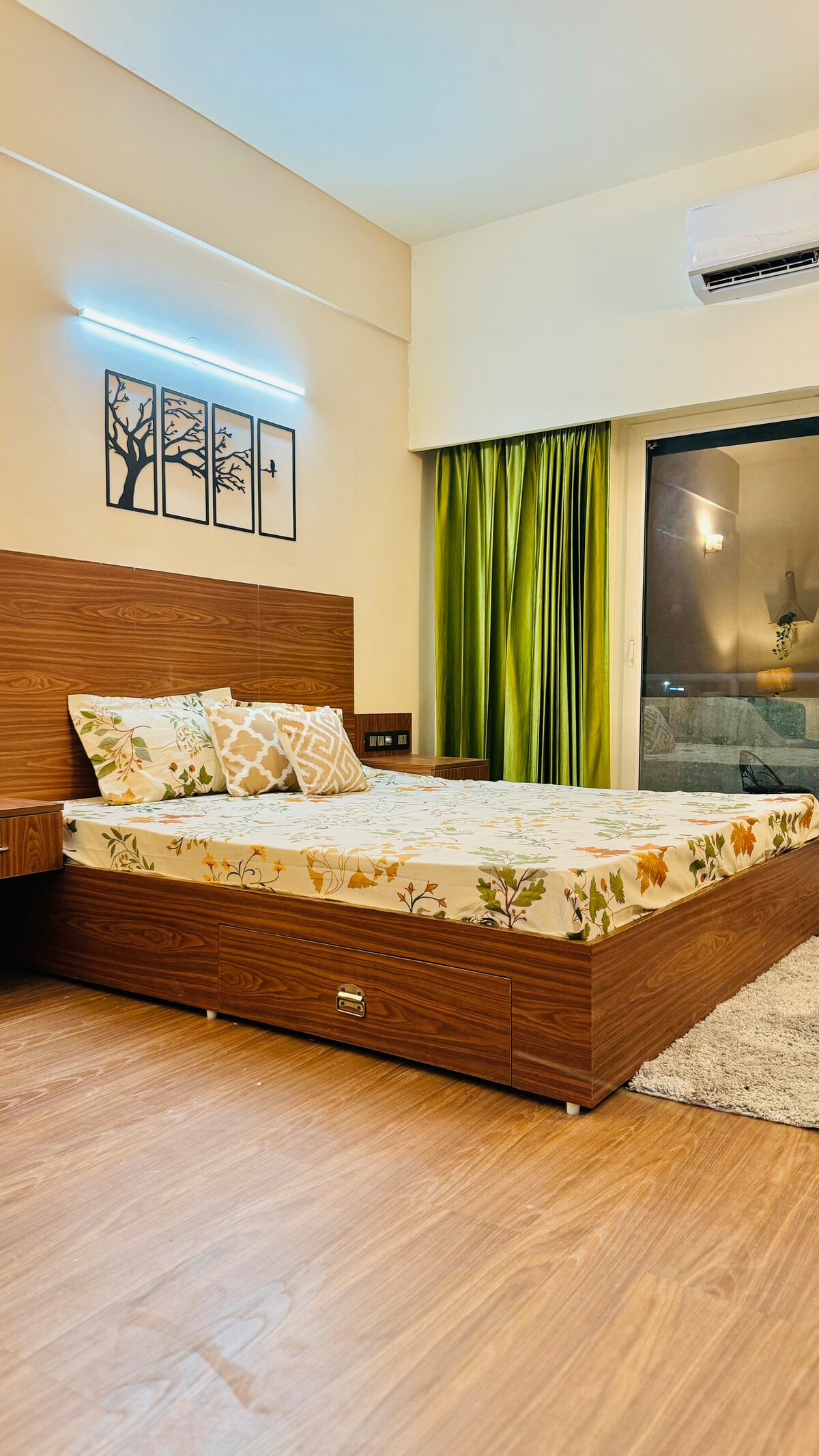 Welcome to Midnight Moon Retreat, a calm and stylish dark-luxury 1BHK inspired by the beauty of the moon and night sky. The bedroom features a glowing moon halo wall, soft ambient lighting, and deep charcoal tones that create a cozy, relaxing, and premium vibe. This space is perfect for couples, solo travelers, or anyone looking for a private and aesthetic stay.