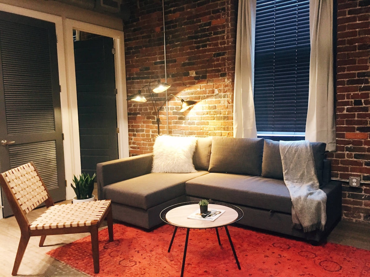 WALK anywhere DOWNTOWN! This Historic loft is in the Heart of the ENTERTAINMENT DISTRICT! One block from Printer's Alley, Broadway (Honky Tonk Row), and the Riverfront. >>> Newly Renovated with a luxurious Modern Design, high ceilings and exposed brick. Bed/Room Arrangement: • Bedroom - King Bed, Walk-in closet • Common - Queen Sleeper Sofa