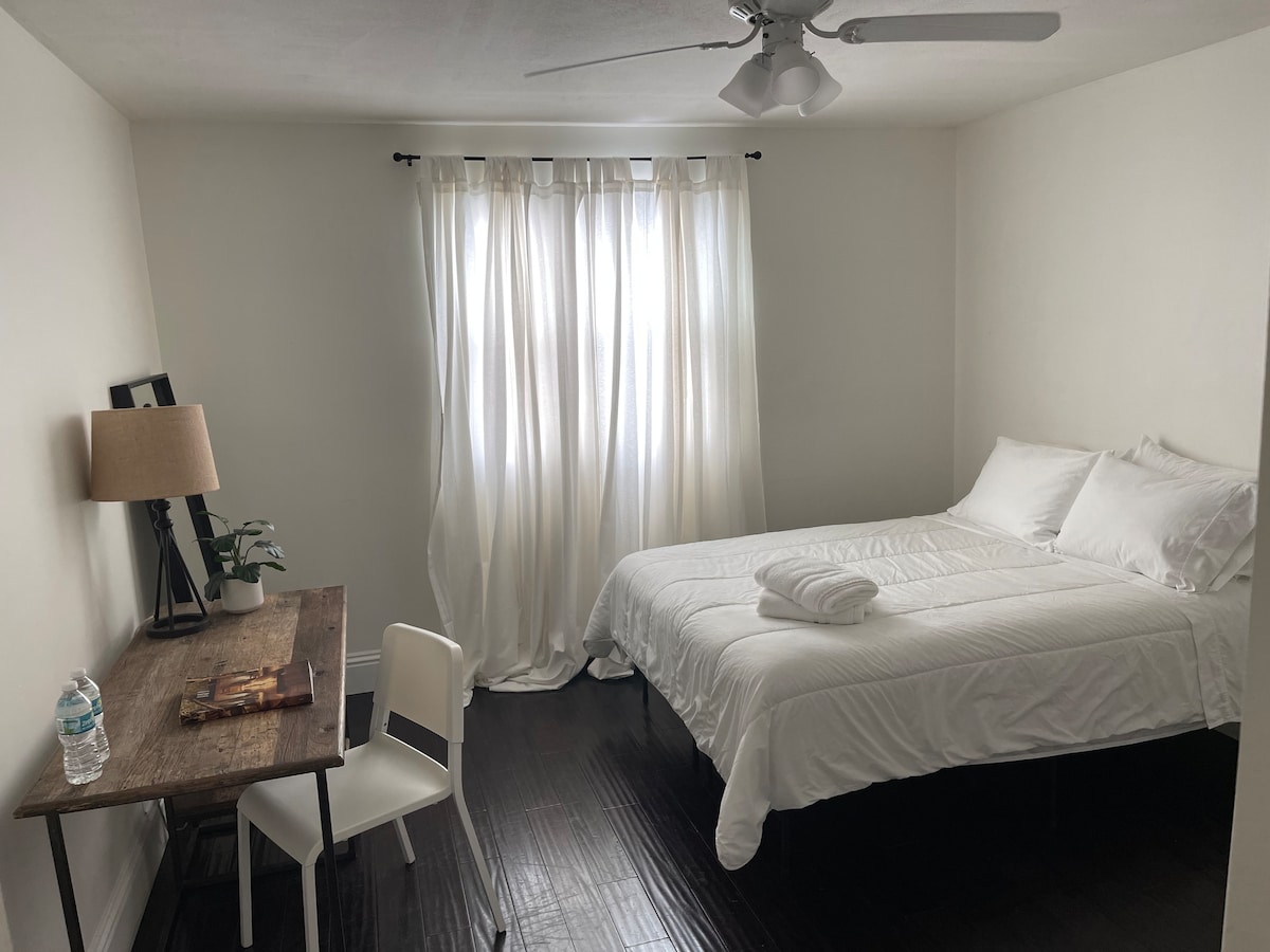 Camera da letto moderna con postazione di lavoro e cortile tranquillo