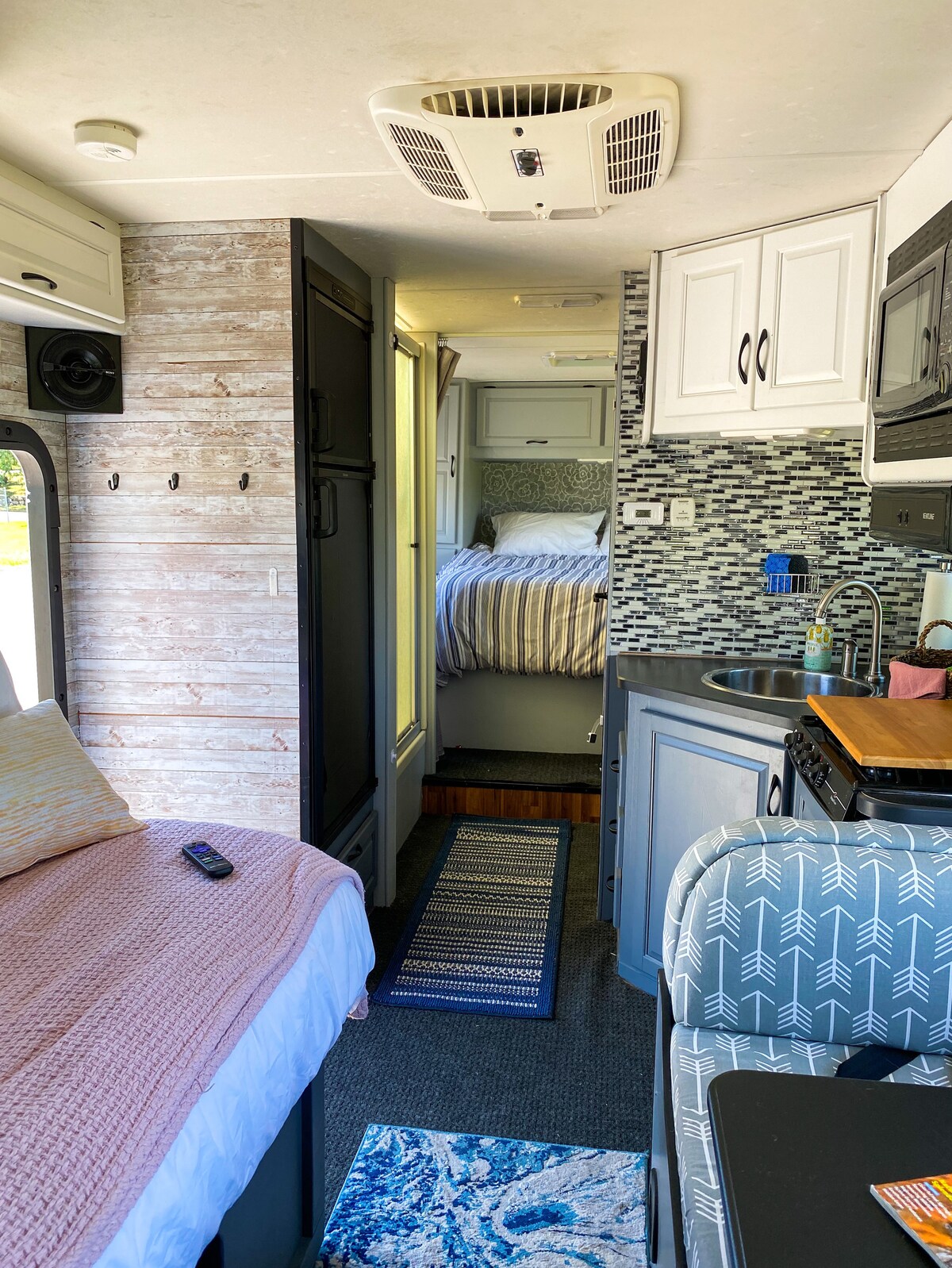 Entra nella tua oasi confortevole e vivi la tua casa lontano da casa in questo luogo incantevole per una vacanza in montagna. Questo camper di 27 piedi è progettato per ospitare comodamente 8 persone: letto matrimoniale principale, divano letto completo, tavolo da cucina convertibile in un letto PIÙ 2 letti a castello. A/C, stufa, fornello / forno a gas a 3 fuochi e forno a microonde. Un'ulteriore caratteristica distintiva è la stanza con zip di 6 metri, dotata di vasca idromassaggio privata con vista sulle montagne, focolare a gas, lampada di calore e tuffo freddo personale per gli avventurieri.