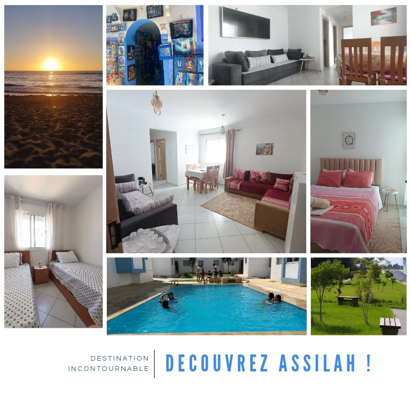 Appartement familial à Asilah, à 30 min de Tanger. Situé à 700 m de la sortie d’autoroute et à 10 min à pied de la plage. Il comprend 3 chambres, une grande salle de bain, un grand salon, une cuisine équipée, climatisation et Wi-Fi. L’appartement dispose aussi d’une très grande terrasse au même niveau, idéale pour se détendre. Parfait pour découvrir Asilah, ses belles plages, sa médina et ses restaurants. Idéal pour un séjour en famille.
