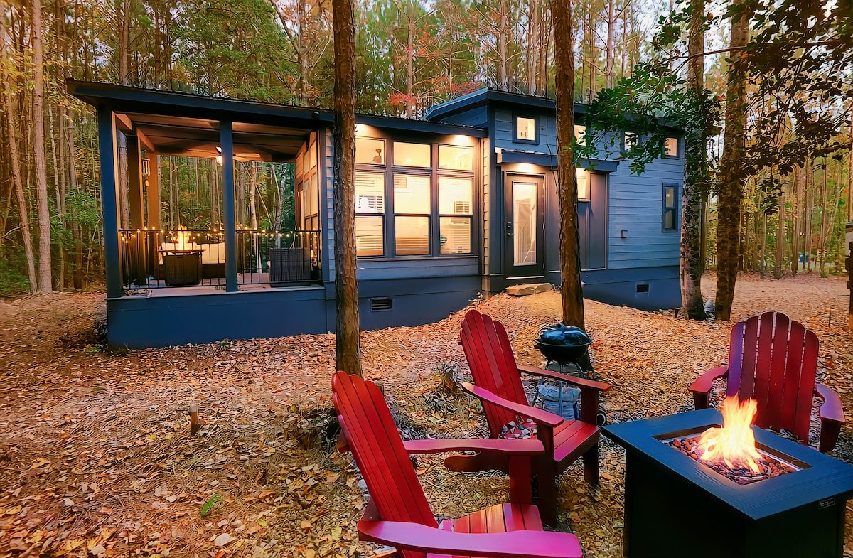 Butterfly Creek Cottage – a peaceful creekside getaway at Blueberry Falls Farm in Mentone, AL! Reconnect w/ nature in this charming tiny home w/ a private hot tub & creek views. Enjoy the wrap-around porch, hanging chairs, & fire pit under the trees. ➤ Hot Tub ➤ Creek & Waterfalls ➤ Wrap-Around Porch ➤ Community Game Room: PS4, Foosball, Pac-Man & Crafts ➤ Community Rooftop Deck & Overlook Bridge ➤ Kid & Pet Friendly A serene getaway where nature, comfort, & relaxation flow together.