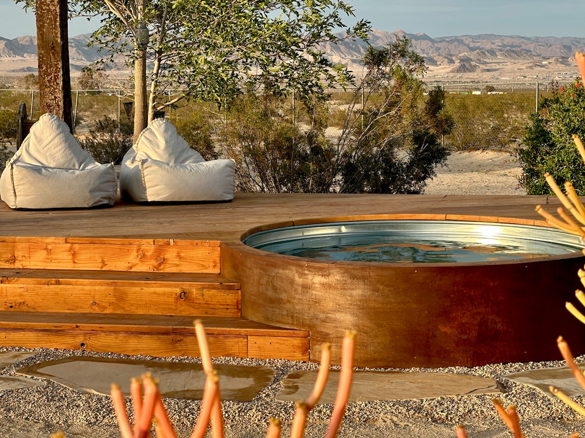 Svegliati con il cielo panoramico del deserto a soli 10 minuti dal Parco Nazionale di Joshua Tree. Questo elegante rifugio con 1 camera da letto è perfetto per coppie, lavoratori da remoto e amanti delle stelle, con una vasca idromassaggio privata, un accogliente focolare e una connessione WiFi ultraveloce. Trascorri le giornate esplorando il parco, poi torna a rilassarti sull'amaca, immergiti sotto le stelle o riunisciti intorno al fuoco. Al mattino, goditi una cucina completamente attrezzata e fai colazione sotto il pergolato al tavolo da pranzo in legno nodoso. Grande cortile recintato ideale per animali domestici.