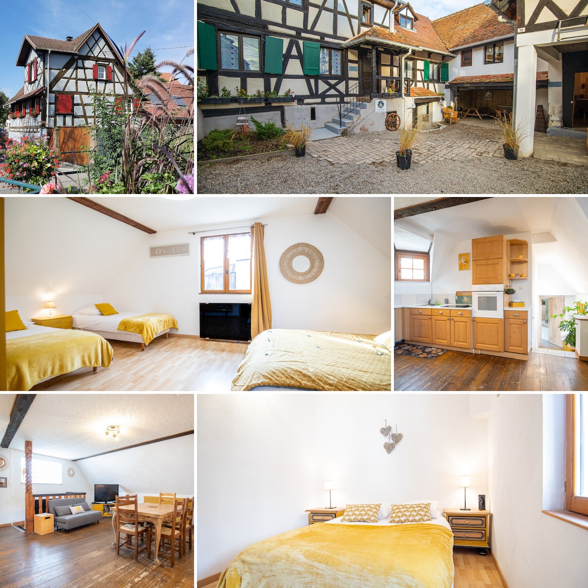 Nei vigneti, centro Alsazia sulla strada dei vini. Un cottage atipico 35 m2 con tutti i comfort in un'antica cantina vinicola. Un posto luminoso, molto accogliente, tutti i comfort. Cucina attrezzata, zona soggiorno, letto matrimoniale ( 1 materasso) bagno , cabina doccia, cassaforte, parcheggio gratuito con terminale elettrico. Giardino privato, pergolato, possibilità su richiesta 48 ore prima della colazione e cena fatta in casa con sapori locali. 2 altri alloggi CHATENOIS, OBERNAI