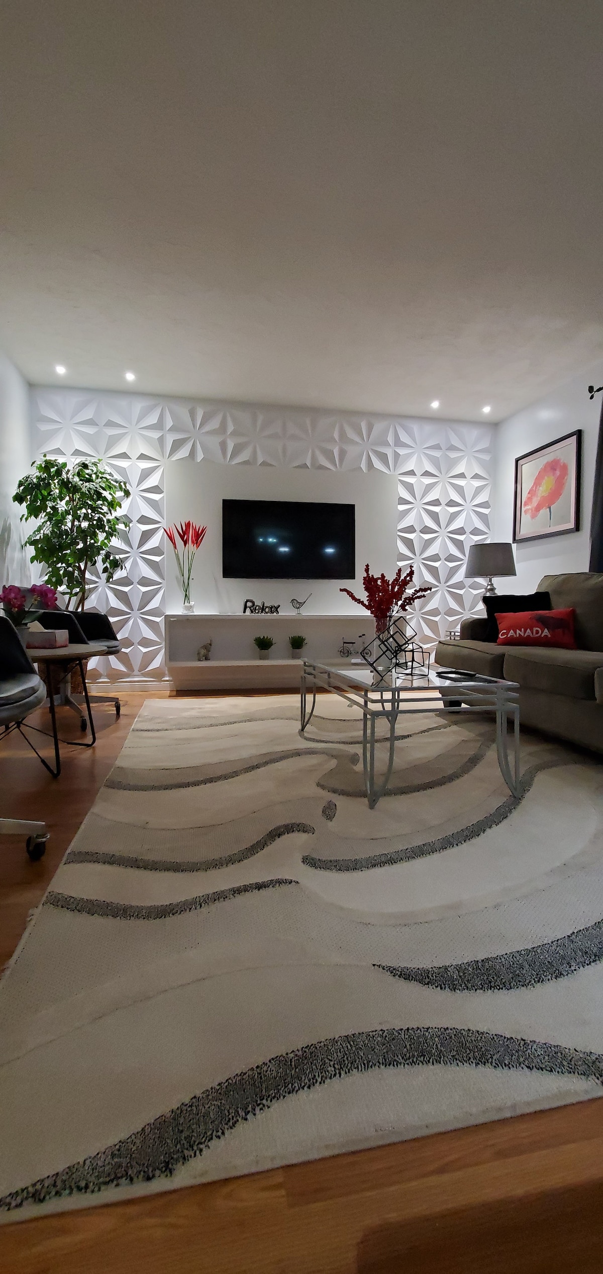 Escape to a calming, modern spa retreat in Dieppe. Enjoy your private hot tub, indoor infrared sauna, and 100-inch projector for a cinematic experience. The space features a Bellini-style modular sofa, sculptural donut chair, and a textured rug, with marble and chrome accents for a relaxed, contemporary feel. Close to Moncton’s attractions, it’s perfect for couples or solo travelers seeking comfort and style. Minutes from downtown, it offers easy access to restaurants, cafés, and shops.