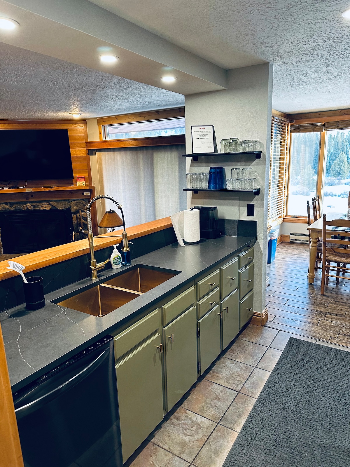 This one-bedroom unit has been recently remodeled in a hip, lake house-inspired style. It has absolutely amazing views across Lake Dillon to the Ten Mile Range. Watch the sunset from the balcony. Walk to the marina to rent a boat or paddleboard. Hop on your bike and hit the path that goes past your front door. Go down to the water's edge and throw out a line to catch your fish dinner. Cool design touches include wood floors throughout, rock sink, mountain-modern furniture, and vintage photos.