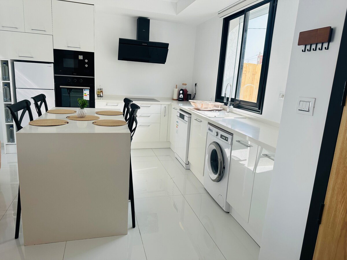 Villa neuve avec piscine située au centre d'Houmet Souk. Quartier calme ,tout à proximité ,supermarchés, boulangeries,restaurants ,station de taxis à tout juste 10 min à pieds. 2 chambres avec 2 lits 90x190 et un grand lit 180x200, dressings. Une salle de bain avec douche. Un toilette. Climatisation A l'étage suite avec lit double 150x190 cm sdb et toilette avec climatisation réversible (chaud et froid). Climatisations réversibles dans toute la maison Lit parapluie bébé sur demande