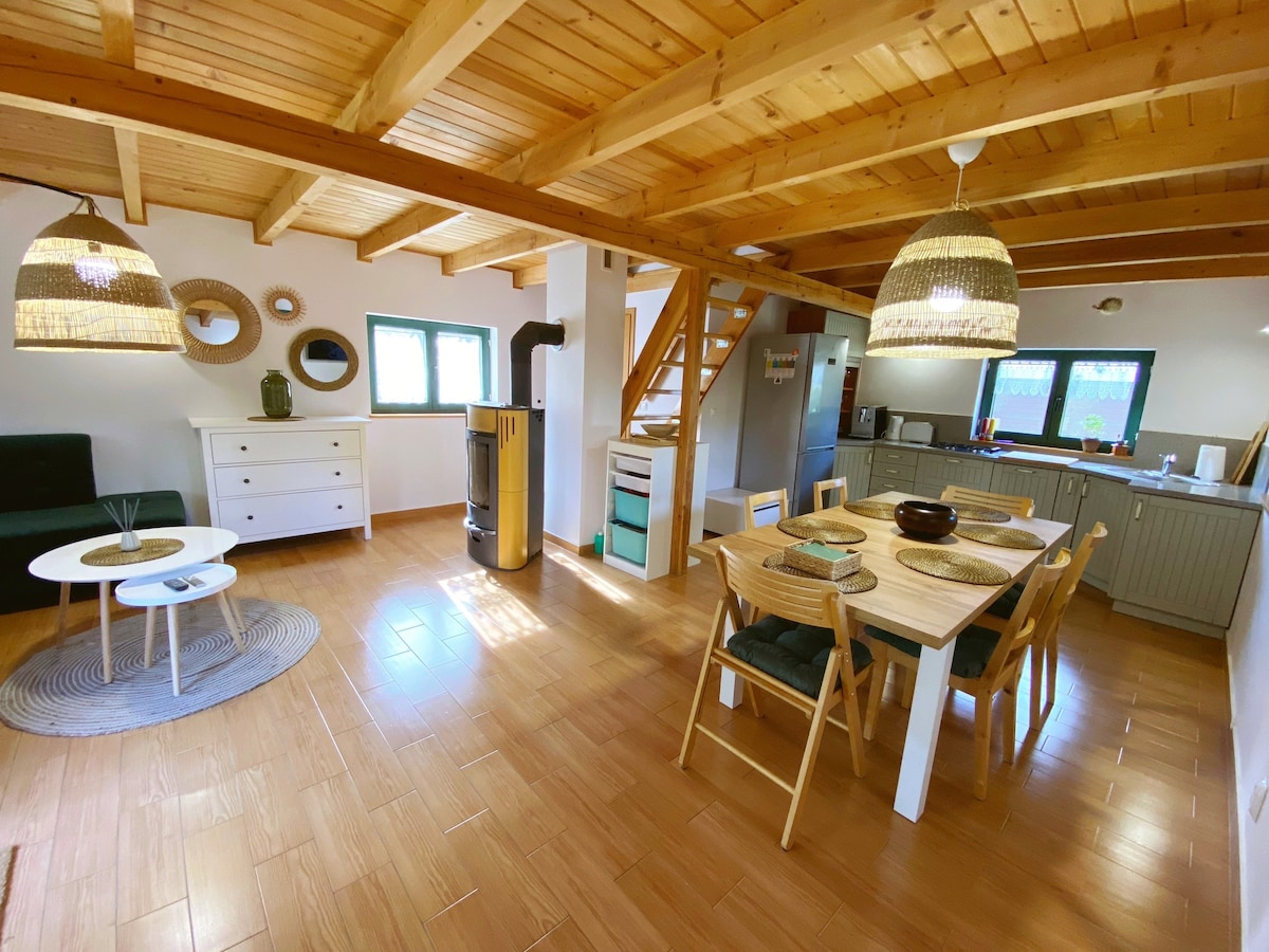 Foresta, tranquilla, calma, ruscello, uccelli che cinguettano, chilometri di sentieri indefiniti, momenti inestimabili... e all'interno di una piscina riscaldata, lettini prendisole, caminetti a legna e tappetini per lo yoga. Il cottage Nut situato nel cuore del deserto di Rzepinska per 6-8 persone, offre un contatto diretto con la fauna selvatica e il comfort per il relax e il relax . Il cottage dispone di 3 camere da letto, una cucina completamente attrezzata, due bagni, un'ampia zona giorno e un'area ricreativa con una piscina interna e riscaldata tutto l'anno.
