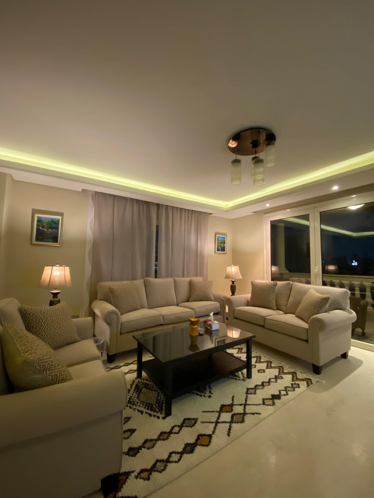 Nile views Luxury Suite with 4-bedrooms, Playstation room, 3-bathroom, The suite is located next to the Four-Seasons Hotel - Nile Corniche - providing a great view of the Nile River. We offer state of the art amenities including two 65-inch TVs with Netflix and a dedicated PlayStation room. We have high-speed Wi-Fi, air conditioning, a fully-functioning modern kitchen, reception, and dining room.