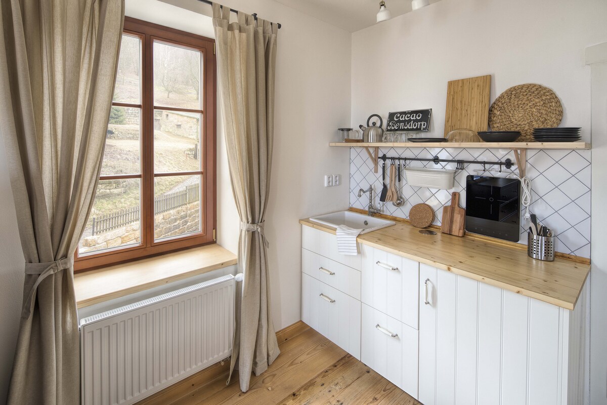 Un appartamento unico di 40 m2 nel cuore della regione di Kokořín con un'atmosfera tranquilla e da prima repubblica - a solo un'ora dal centro di Praga! Offriamo alloggi tutto l'anno in un appartamento spazioso e dotato di tutti i comfort, con cucina privata e terrazza con vista eccezionale. Ideale per un riposo attivo, un weekend romantico, una vacanza in famiglia. Nelle immediate vicinanze del lago di Mácha, dei castelli di Bezděz, Kokořín e Houska. La zona è attraversata da piste ciclabili e sentieri escursionistici.