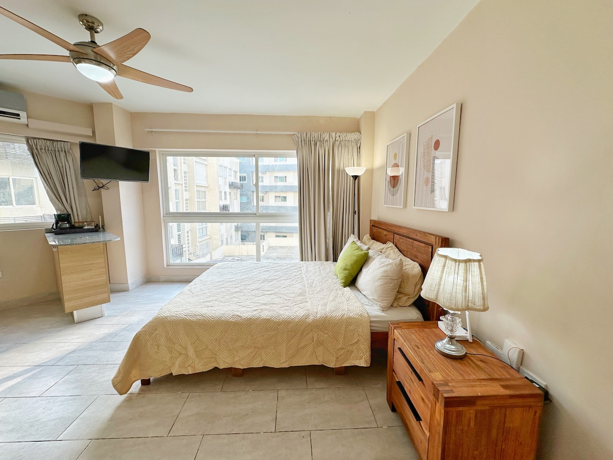 Accogliente e spazioso monolocale sul lungofiume con vista sulla zona coloniale. Puoi sentirti a casa, venire a rilassarti, lavorare e goderti la bellissima città di Santo Domingo o la magica Zona Coloniale. Nel nostro monolocale troverai una Smart TV, il wifi ad alta velocità, elettrodomestici da cucina, una lavanderia e altro ancora.