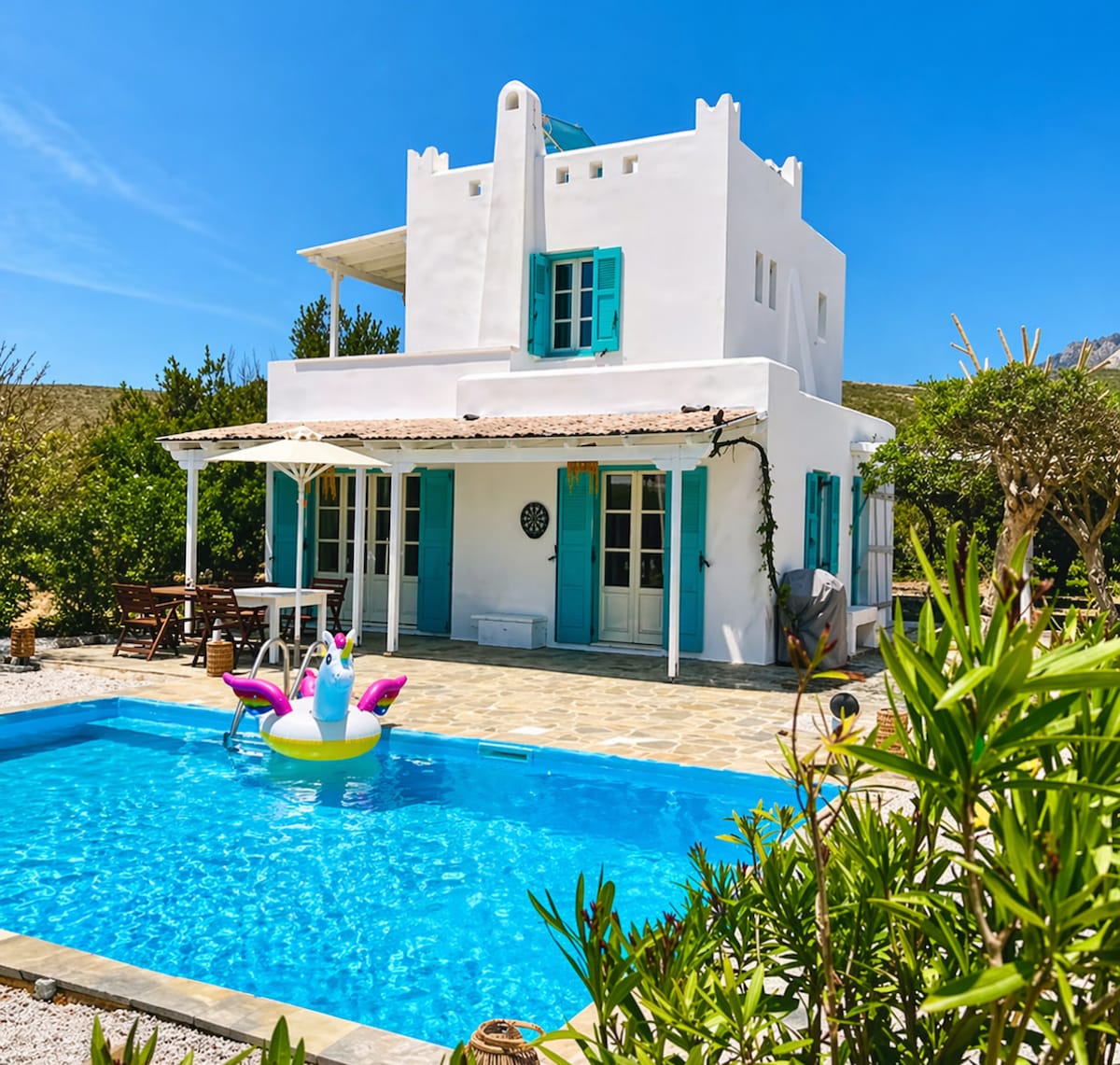 Questa casa cicladica offre un soggiorno rilassante e divertente per tutta la famiglia. È bello vivere tra gli ulivi, i limoni e i cinguettii delle cicale. La piscina ti rinfrescherà dopo esserti rilassato al sole. Lo chalet e l'altalena delizieranno sia i giovani che gli anziani. Trascorrerai una vacanza eccezionale con la famiglia. Idealmente situato a Eggares, la valle del limone, in campagna, a 15 min. dal porto, a 1,3 km dalla spiaggia di Amitis, vicino al museo degli ulivi.