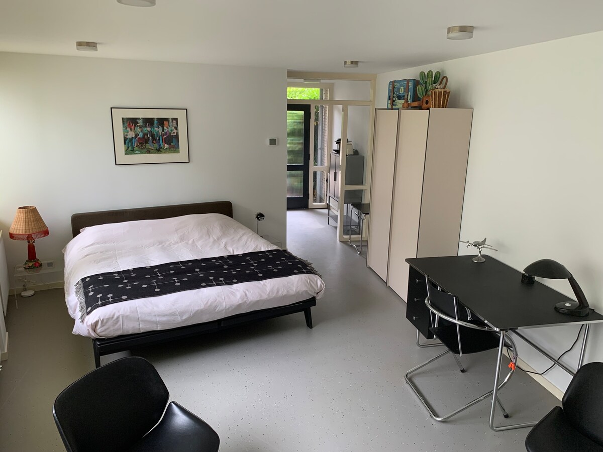 Abbiamo una pensione indipendente sul retro della nostra proprietà, 50 metri dietro casa nostra e il nostro campo da tennis privato. Posizione perfetta per visitare Utrecht e Amsterdam (10 e 40 minuti in treno, e la stazione è raggiungibile a piedi). Ideale anche per escursioni in bicicletta ed escursioni perché siamo nel Parco Nazionale "Utrechtse Heuvelrug". Il noleggio è incl. max. 2 ore (al giorno) uso del nostro campo da tennis. Ti preghiamo di indicare in anticipo se vuoi giocare a tennis. Le biciclette possono essere riposte in sicurezza qui.