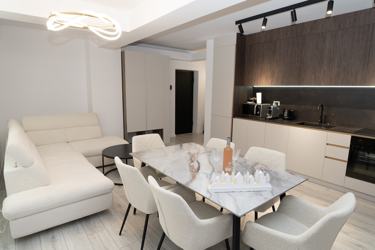 Appartamento di lusso a Suceava • A soli 6 km dall'aeroporto • Letto matrimoniale + divano letto grande • Cucina: macchina per caffè espresso, forno, piano cottura, frigorifero, forno a microonde, tostapane, stoviglie nuove • Grande TV + audio surround • Wi-Fi, aria condizionata, videocitofono • Lavatrice con asciugatrice, ferro da stiro • Bagno con prodotti di alta qualità, asciugacapelli, asciugamani morbidi • Check-in flessibile, anche di notte • Parcheggio gratuito e custodito • Comfort, stile e tutto il necessario per un soggiorno perfetto