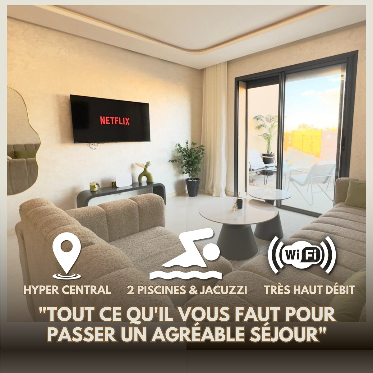 Questo nuovo appartamento elegante, moderno e tranquillo si trova nel centro di Marrakech. Siamo a 12 minuti di auto dall'aeroporto, a 4 minuti dalla stazione ferroviaria (ONCF), a 2 minuti da M Avenue, a 10 minuti da Jamaa Elfna, a 2 minuti da L'Hivernage e a 5 minuti da Gueliz. L'appartamento è composto da una camera con letto molto comodo, una zona soggiorno arredata con gusto, una cucina ben attrezzata e un balcone soleggiato. Questo alloggio unisce stile e comfort. ✅Netflix ✅IPTV Wifi ad✅ alta velocità