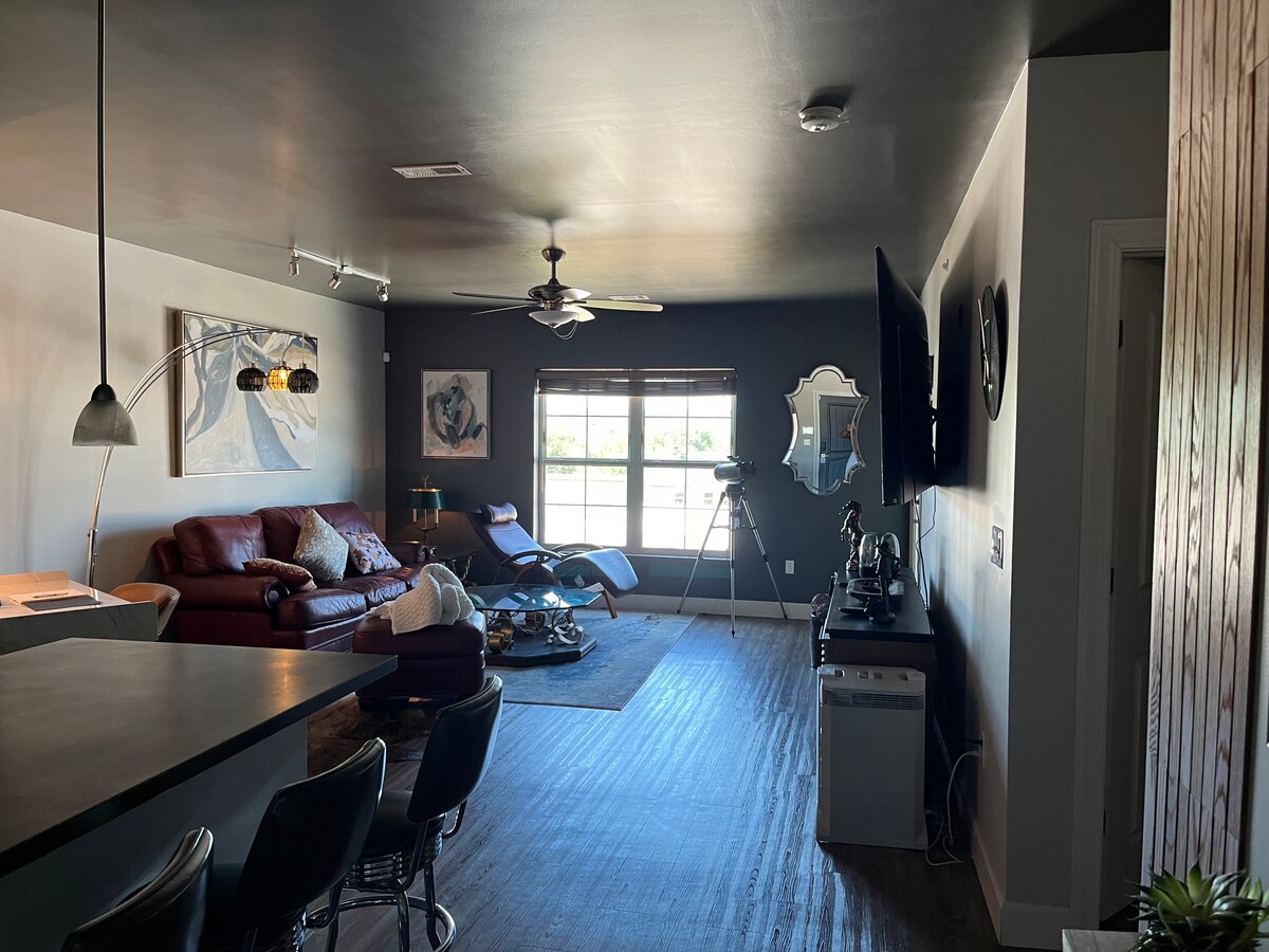 Spazio ben progettato che è sia energizzante che curativo a un isolato dal cuore di Mass Street nel centro di Lawrence. Preparati a rimanere a bocca aperta di fronte a questo moderno loft con porta del garage in vetro e balcone che si affaccia su un'enorme terrazza... dotata di vasca idromassaggio, grill e camino. Nuova TV a schermo piatto da 75", finto camino, zona pranzo, bagno completo, lavatrice/asciugatrice, letto matrimoniale e letto a scomparsa. Letteralmente di fronte ai migliori bar, ristoranti e negozi di Lawrence, ti piacerà qui.
