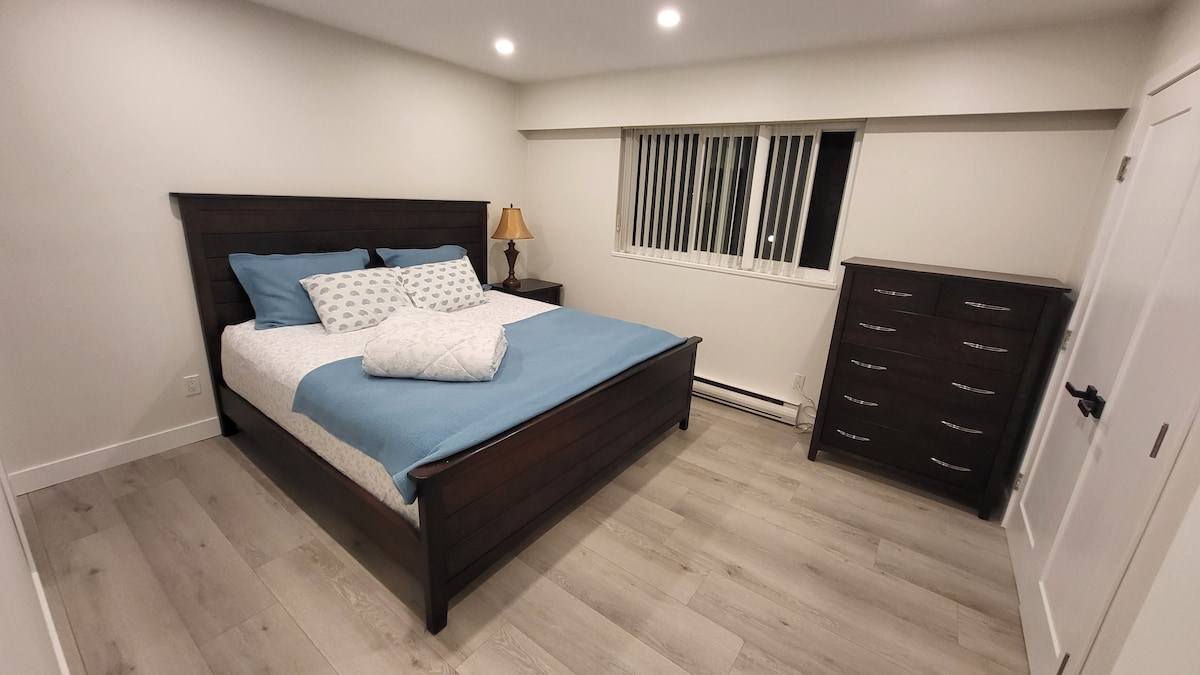 Bright brand new one bedroom suite with street level private access. The suite comes with a queen size bed in the bedroom and a double size sofa bed with memory foam mattress if you need extra sleeping space. Fully stocked kitchen with stove, oven, microwave, coffee maker, toaster, and much more. This suite has its own washer/dryer and dishwasher. The bathroom comes with a large rain shower. The suite is 5-minute walk to bus stop, beach, playgrounds and 15-20 minute drive to local mountains.