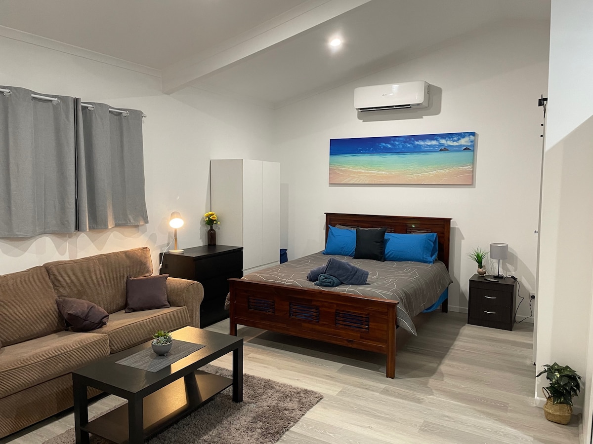 Posizione! Cammina fino alla spiaggia! Si tratta di un moderno monolocale indipendente con un comodo letto queen-size e un piccolo divano letto estraibile, una grande smart tv, aria condizionata, WIFI, bagno privato con doccia, servizi igienici e lavanderia. Dispone di una cucina attrezzata. Si trova a 2 isolati a piedi dalla spiaggia, dal Beachouse Hotel e dal caffè Enzo. Parcheggio custodito a 1 metro dalla porta d'ingresso dell'unità. Non avrai bisogno di un'auto o di un taxi per andare dal cuore di Scarness e dalla spiaggia all'alloggio.