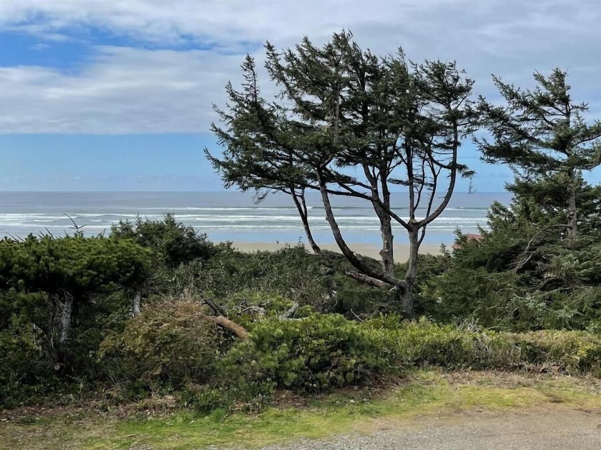 DOG FRIENDLY, WALK TO TOWN! This one-of-a kind A-frame sits on 8 miles of pristine beach. You can’t beat this oceanfront location! The charming cabin comes with a fully furnished kitchen and ocean view dining. The master bedroom is upstairs over the main room of the A-frame and has an ocean view and half bath. The main floor has a full bath, queen bed and a pull out Comfort Sleeper queen bed plus a cozy pellet stove! Relax on the large enclosed oceanfront deck and enjoy the amazing sunsets!