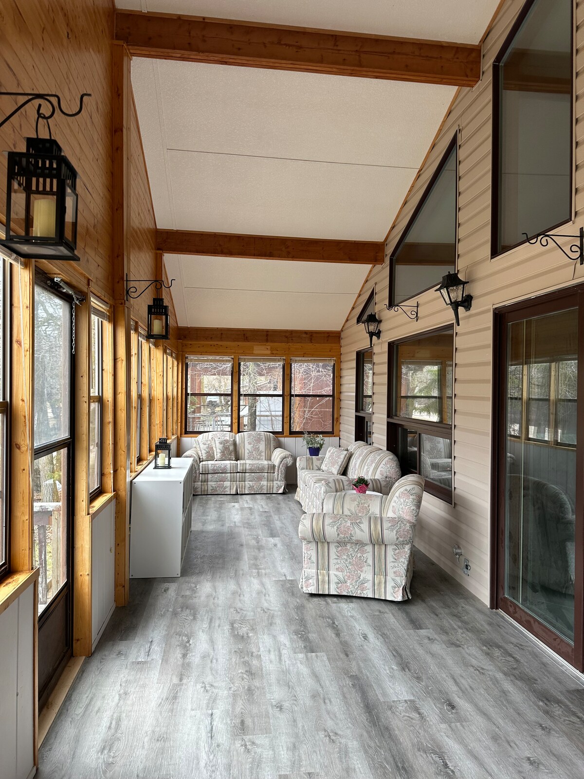TWO MINUTE WALK to the beach. After purchasing this lake home in 2024 we carefully renovated it. The kitchen, dining room and living room (with wood-burning fireplace) are open-concept. A large 3-season sunroom spans the front of the house. Each bedroom has fresh linens, down comforters and electric heat control. The back yard is private, well-treed and fully fenced, with a firepit. Sandy beaches, miles of walking trails and in winter, ice fishing. Our beach town is a perfect vacation spot!