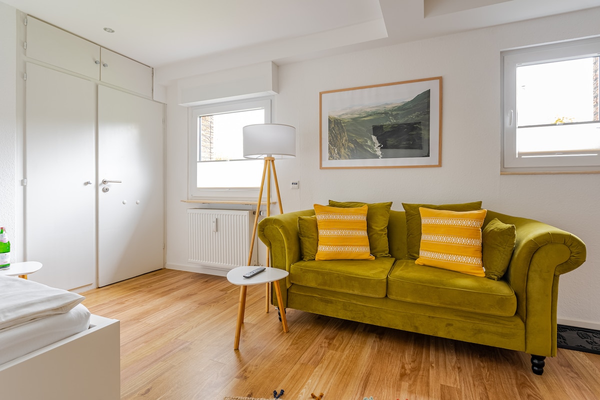 L'appartamento è situato in posizione centrale a Düsseldorf -Friedrichstadt. L'appartamento è composto da zona pranzo e soggiorno con divano letto (con materasso a tutta lunghezza) e da una camera da letto. - Smart TV e balcone. Nella camera da letto separata vi sono un grande letto matrimoniale e un ampio armadio. C'è anche una grande e luminosa scrivania. Lì può dormire anche la terza persona sul letto supplementare. I letti sono già fatti e gli asciugamani sono stati preparati.
