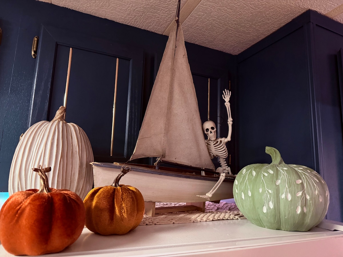Welcome aboard your lake escape!! This captain's cozy, boathouse-themed tiny home is perfect for family fun—complete w/private hot tub, outdoor TV, grill gazebo, mini fish themed bar, & fire pit that is a walk away from the beach. Enjoy lakes, mini golf, tennis, & more in an amenity-packed community. Make s’mores, tell scary sailor stories, watch movies, play games, or create lakeside memories aboard your trip to Eagle Lake, PA! Halloween decor til Nov 23rd - Christmas decor Nov 23rd to NYE!
