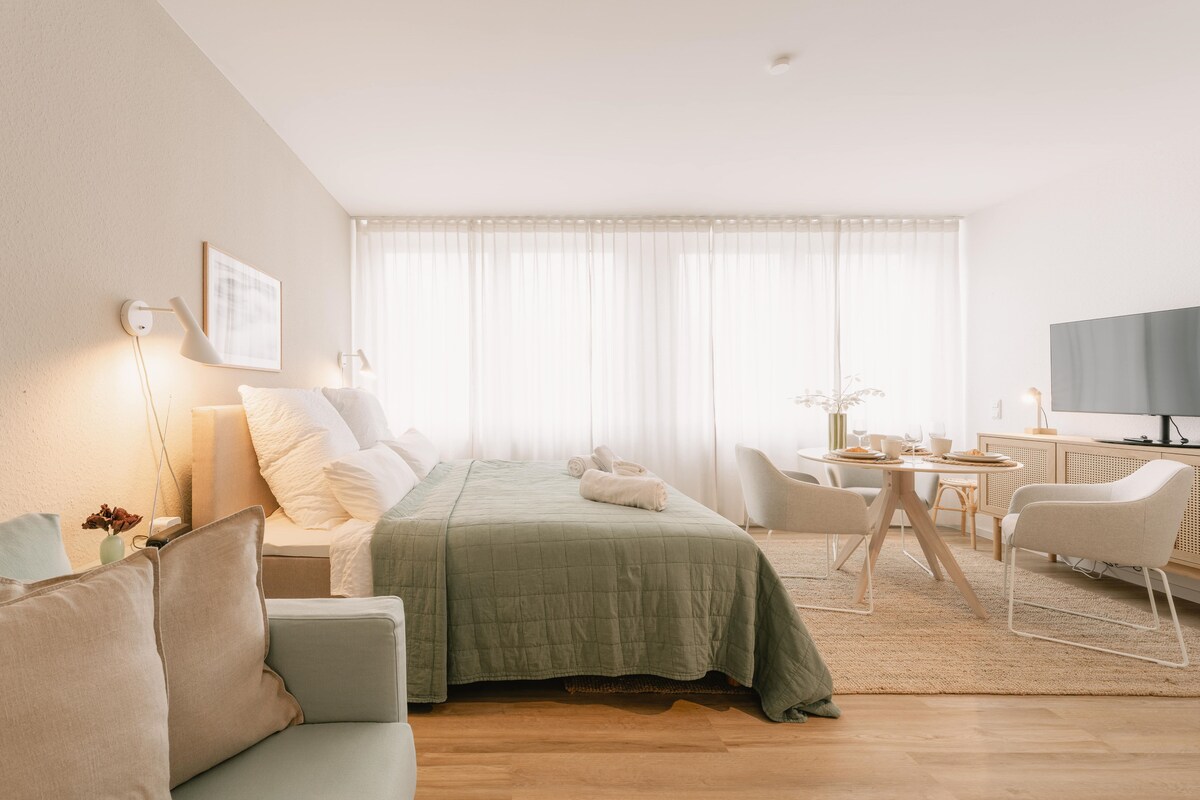Goditi una pausa rilassante con tutta la famiglia in questo appartamento tranquillo e arredato con stile, con una splendida vista sul verde. Il generoso appartamento con 4 camere da letto offre tutto ciò che il cuore desidera: Una cucina moderna completamente attrezzata invita a cucinare insieme. Due balconi soleggiati e arredati offrono rifugi ideali per rilassarsi e soffermarsi. Per l'intrattenimento, sono disponibili smart TV con Netflix nel soggiorno e nella prima camera da letto. WC separato.