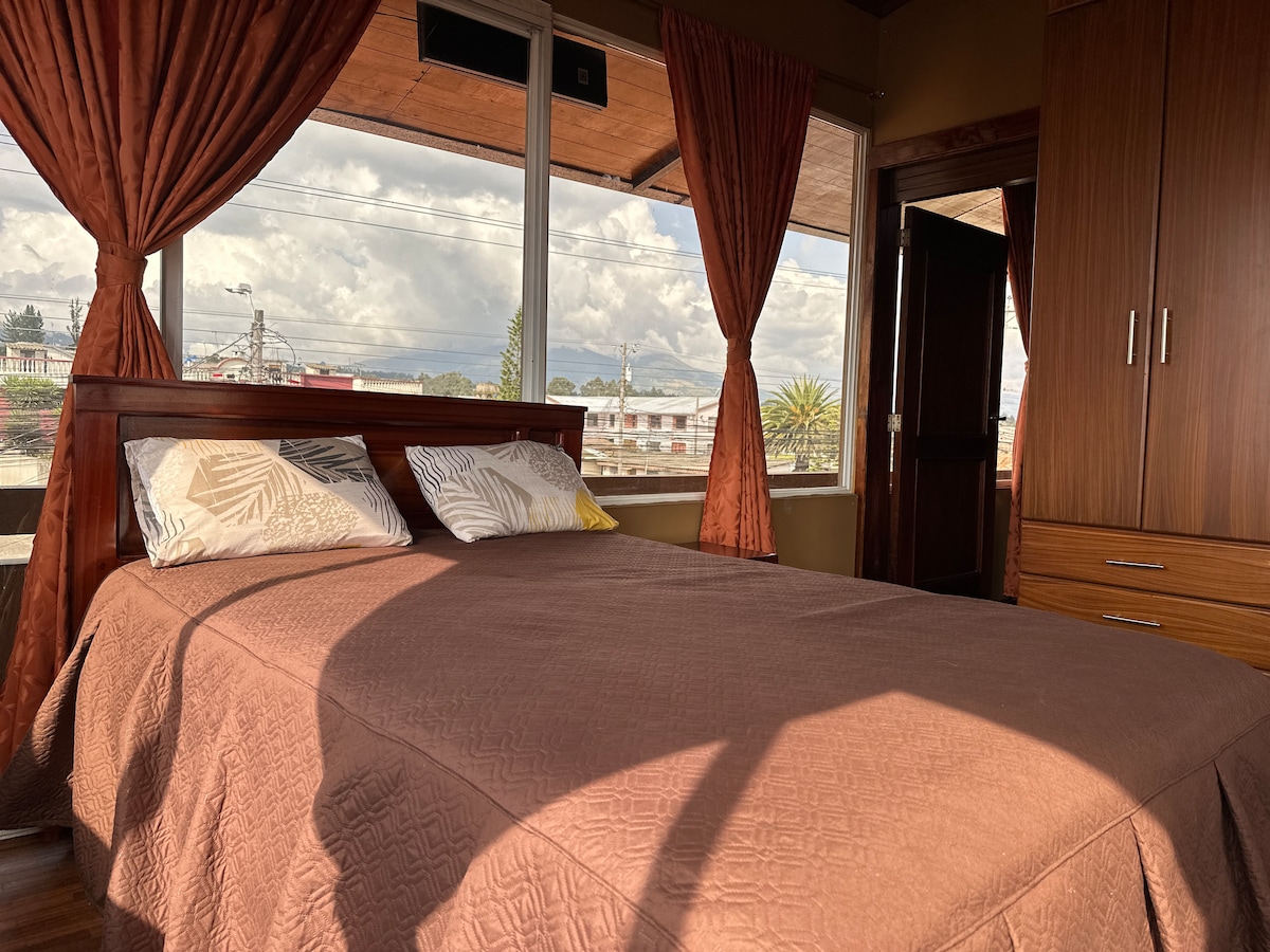 👋 ¡Gracias por llegar hasta aquí! 🌟Quédate con nosotros en Tabacundo 🛏️ 2 habitaciones: 1 con cama matrimonial 1 con litera (3 camas en total) 🚿 1 baño privado con ducha 🧺 Lavadora disponible 📺 TV y 📶 WiFi incluidos 🪟 Grandes ventanales 🌄 Balcón con vistas a las montañas del sur 🚗 Parqueadero disponible 🪞 Closets amplios 🪑 Zona de trabajo 📍 Ubicado en el 3er piso (acceso solo por escaleras). IMPORTANTE: El desyuno está disponible pero no incluido.