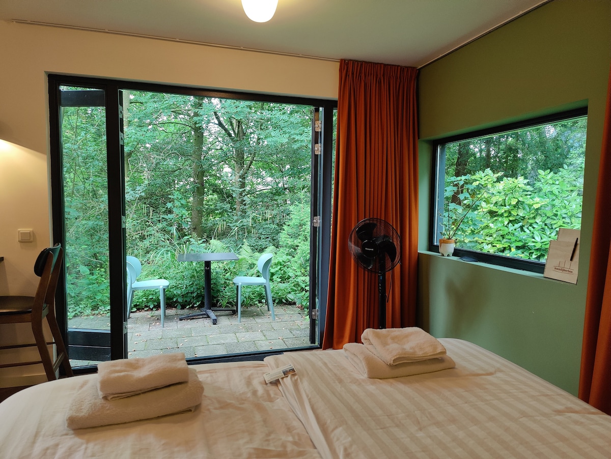 Una stanza privata con ampio letto matrimoniale. La stanza è luminosa attraverso finestre e portefinestre. Attraverso le portefinestre conducono a una terrazza privata, dove potrai sorseggiare un drink al sole serale. Vista sul giardino. Una doccia/WC privata e un sedile. La camera è dotata di riscaldamento a pavimento e aria condizionata. Nel quartiere di Fort Wellness Resort Beemster (5 km), Amsterdam (20 km), Zaanse Schans (15 km), Volendam (10 km), Graft/de Rijp(10 km), IJsselmeer o la costa del Mare del Nord.