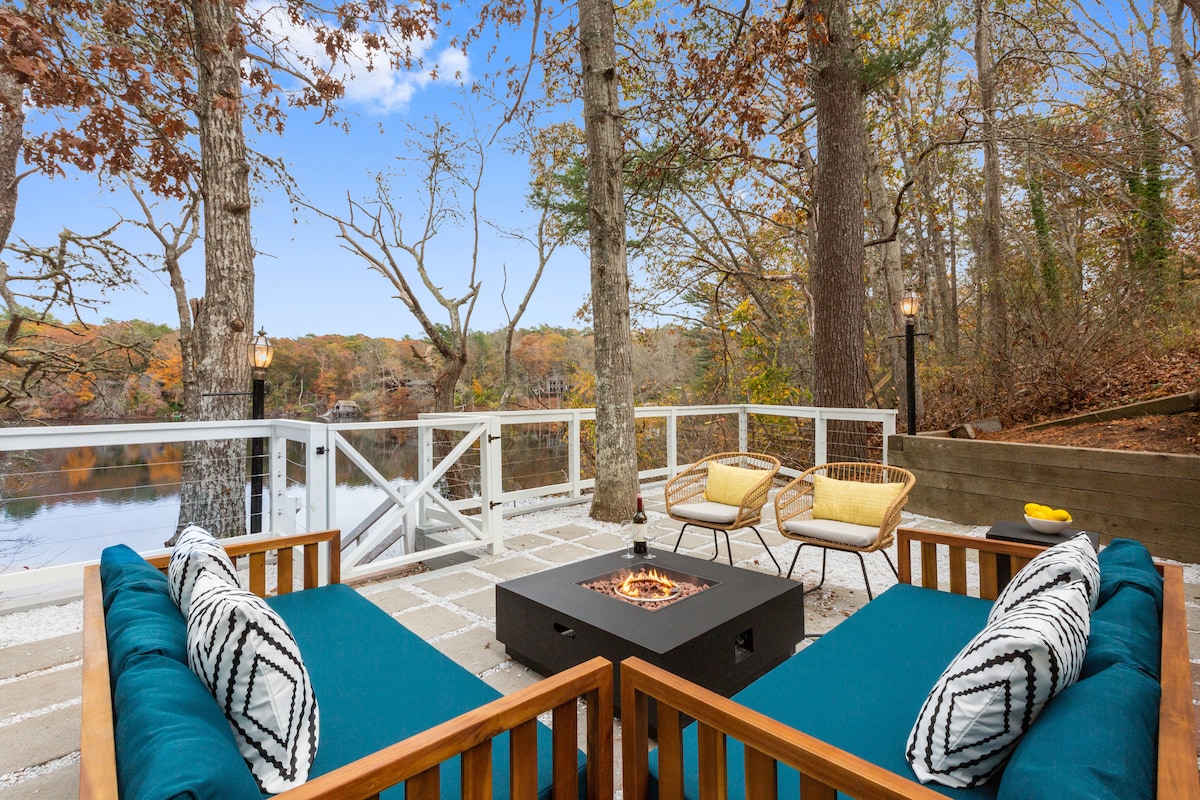 Soffitti alti con travi a vista, cucina a vista soleggiata e spaziosa e soggiorno con finestre a tutta altezza che si affacciano sul lago. Terrazza di grandi dimensioni, perfetta per godersi il barbecue e la vista, con comode sedie a dondolo. A pochi minuti dal pittoresco villaggio di Falmouth e da Mashpee Commons. Stai organizzando una riunione o una gita aziendale? La casa accanto è disponibile per l'affitto! Consulta il seguente annuncio: "Stunning 4-bedroom Private Fresh Water Beach Front".
