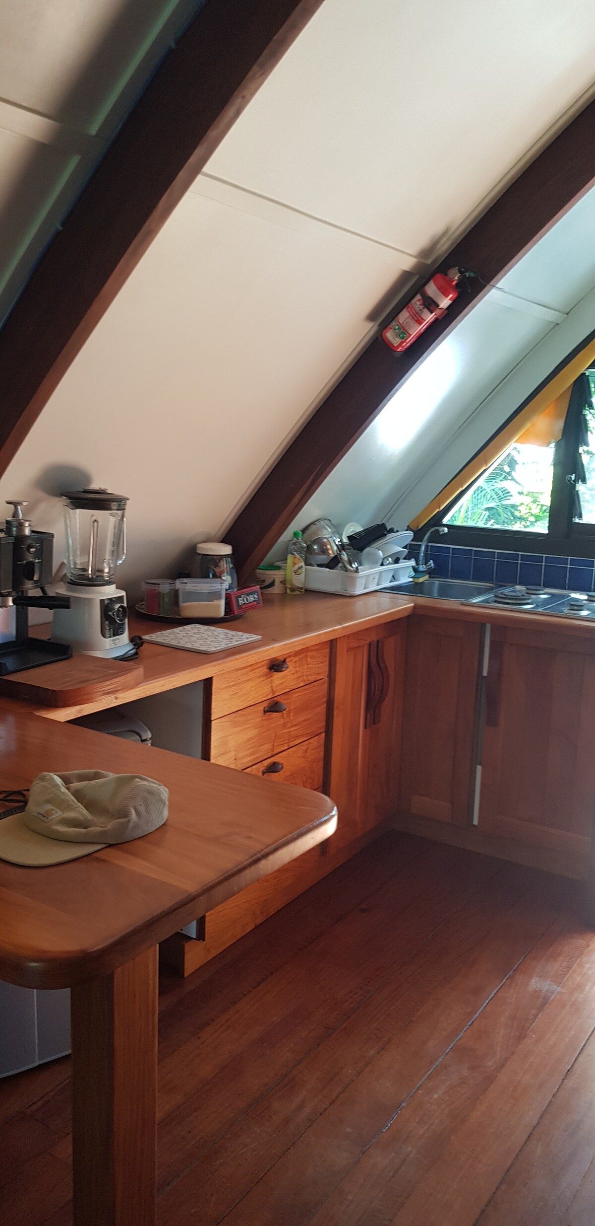 Immerso nella collina con splendide viste sull'oceano, questo bungalow indipendente è perfetto per coppie, famiglie o ospiti singoli che desiderano un accogliente rifugio nella natura. La stanza ha tre letti queen size in tre camere da letto, due in un soppalco. I servizi includono un bagno privato al piano inferiore e una toilette al piano superiore, un'accogliente zona giorno, un angolo cottura compatto, un ripostiglio e una spaziosa veranda. Sono disponibili Wi-Fi gratuito, servizio di lavanderia e parcheggio fuoristrada. L'accesso avviene tramite una passerella in pendenza e scale in salita.