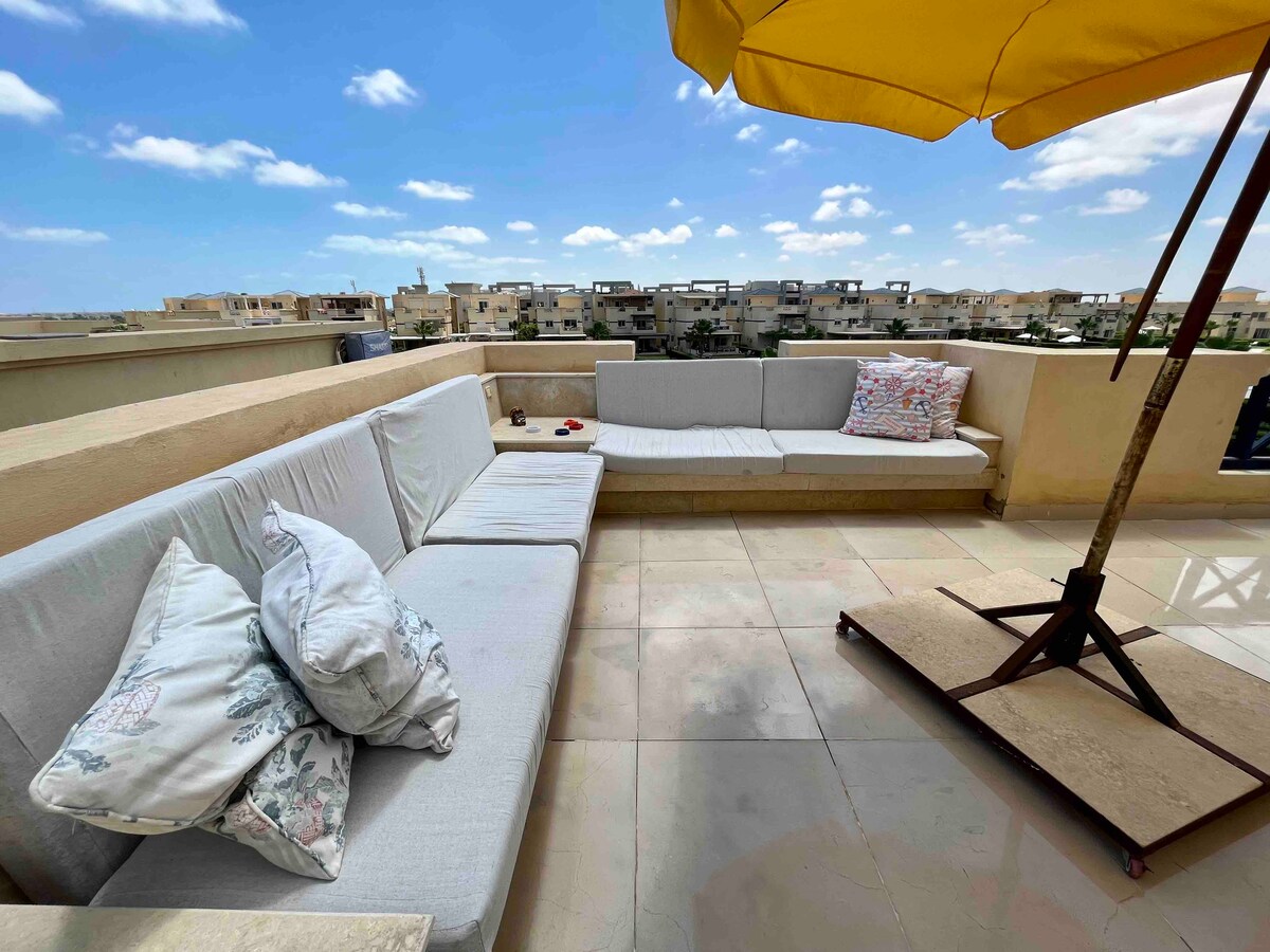 Incantevole e accogliente chalet sul tetto con 2 camere da letto al secondo piano (ESTENSIONE di Stella Sidi Abdelrahman) con vista sulla piscina e sul giardino, dispone anche di un'enorme terrazza con barbecue e un pergolato con tavolo e sedie. Il supermercato (Dreams) è vicinissimo, che ha tutto ciò di cui avrai bisogno prima di andare in spiaggia o cenare nel tuo alloggio. Lo chalet è fornito di tutto il necessario ed è molto pulito e confortevole con aria condizionata in entrambe le camere. La vista dalla terrazza è mozzafiato.