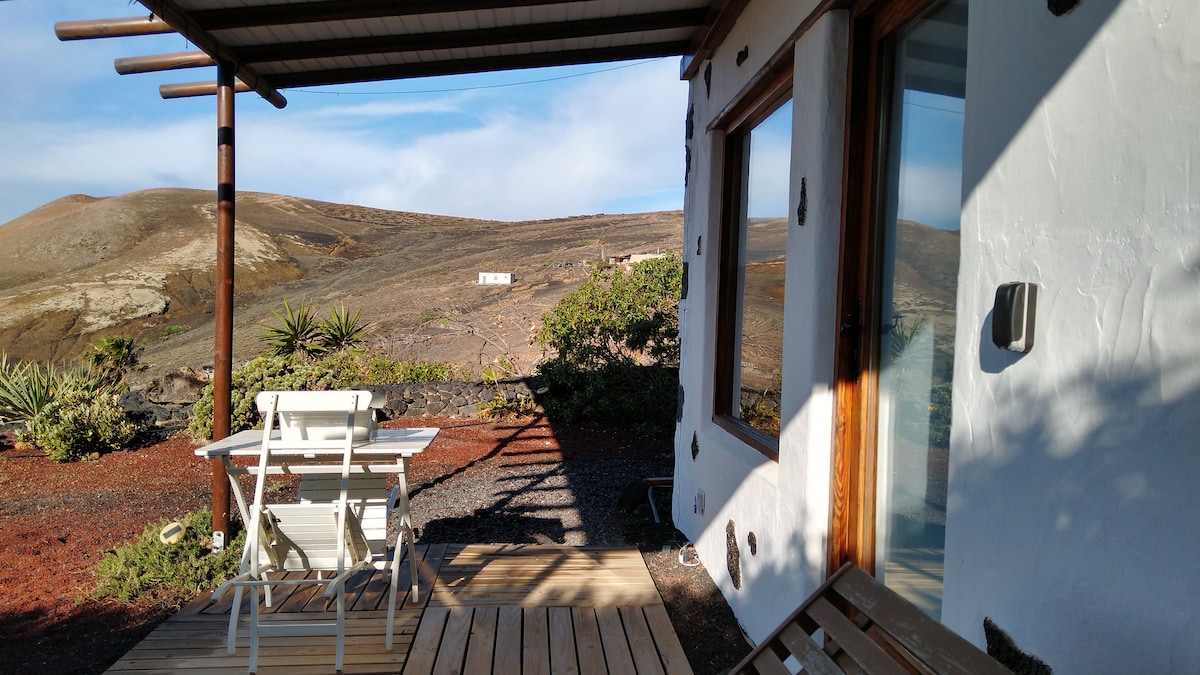 Stay in one of two charming 80 sq m modern hippie apartments with a unique view of Timanfaya National Park and its volcanoes. The apartment features a fully equipped kitchen, a living room with panoramic sliding doors and a sofa bed, HDTV, fiber optic internet, and a bedroom with a Canarian-style en-suite bathroom. Relax on your private terrace, dip your toes in the César Manrique saltwater pool, enjoy the endless vistas, and marvel at magical sunsets. 🩵