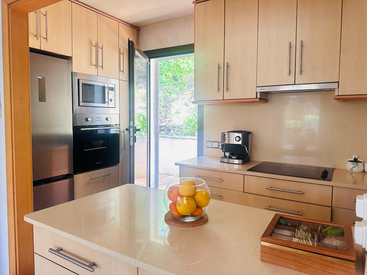 Rilassati con tutta la famiglia in questo alloggio tranquillo. Casa spaziosa, con arredi minimalisti e funzionali. Ha tre grandi camere da letto e una suite con bagno e spogliatoio. Dispone di una terrazza al piano superiore per le tre camere da letto e un portico con una piscina proprio di fronte; entrambi si affacciano sul mare e sulle montagne. Dispone inoltre di due garage; uno per riporre due auto all'interno e un garage esterno per diverse auto, dove c'è una grande area esterna per giocare e dove si trova il barbecue.