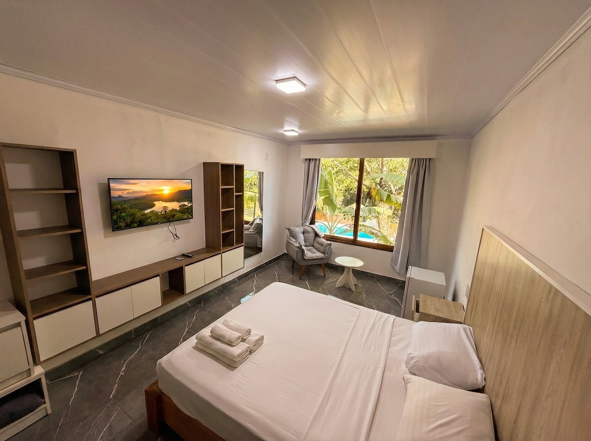 Appartamento al piano terra di un edificio nel bel mezzo di Eldorado, di fronte al Sanatorio IMI. Dispone di 1 camera da letto con letto matrimoniale, Smart TV, accesso a un patio interno privato, armadio per i vestiti; un bagno impeccabile con doccia e termocisterna; e una cucina - sala da pranzo con utensili da cucina, oltre a frigorifero, tacchino elettrico, anafe, forno elettrico e alcuni elementi come caffè, tè, sale, olio, zucchero, tra gli altri. C'è anche un letto da marinaio nella sala da pranzo.