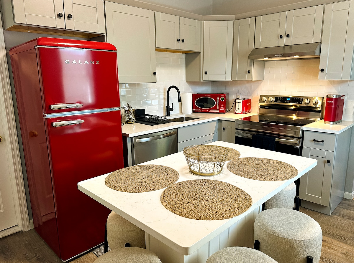 Welcome to Hipster Basecamp, a curated space where mid-century design meets modern comfort. Enjoy bold touches like a double-sided fireplace, Smeg appliances, and a ceiling-mounted rain shower. Brew espresso or mix cocktails with everything at your fingertips, then head to the deck to unwind and take in the peaceful view. Admire original artwork throughout — and if a piece speaks to you, it's available for purchase. (*note: record player is currently out of order)