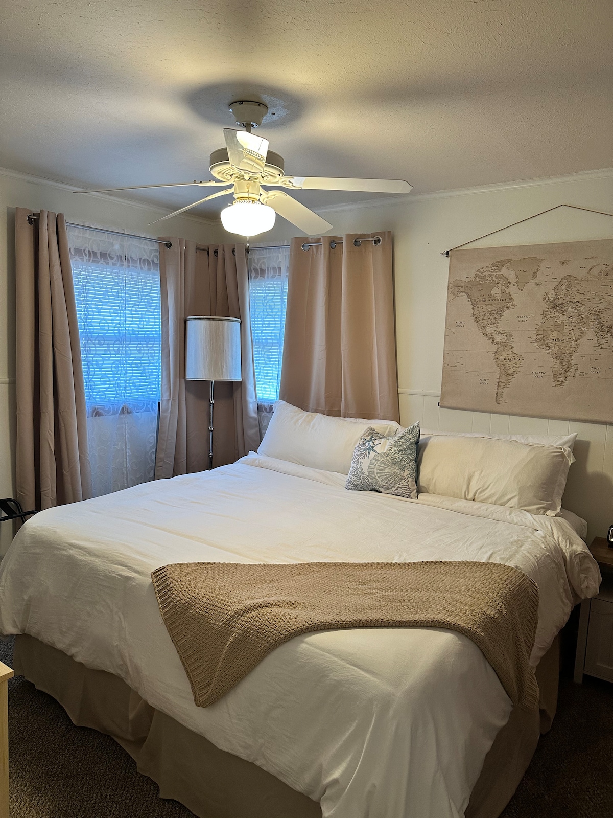 Bungalow storico di 100 anni: 2 camere da letto e 1 bagno con vasca originale con piedini e doccia, divano letto matrimoniale, lavatrice/asciugatrice di grandi dimensioni, cucina completamente attrezzata con piano cottura a gas, ampio soggiorno e sala da pranzo a pianta aperta, Smart TV da 58 pollici, spazio di lavoro, ampio cortile, condizionatori a finestra con stufa a gas a parete. Situato in posizione centrale vicino al centro di Enid, piste ciclabili, base aeronautica di Vance, Leonardo Discovery Warehouse, negozi di antiquariato, Railroad Museum of Oklahoma, David Allen Memorial Ballpark, birrerie e ristoranti, ecc.