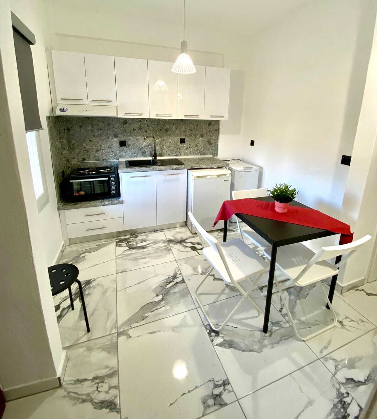 This beachfront apartment features a spacious balcony with beautiful views of Thermaikos Bay and Thessaloniki. It includes a large, cozy living room with a sofa that converts into a double bed, as well as a kitchen with an additional sofa. The small yet comfortable bathroom has a shower and a tap for everyday needs. The kitchen is equipped with a mini oven and complimentary laundry facilities. Additionally, there is unlimited 300 mbps Wi-Fi. The apartment has been fully renovated.