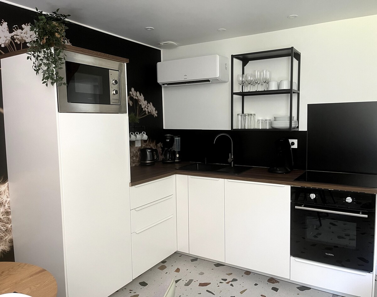 Un vero e proprio rifugio di relax, a soli 6 minuti dall'autostrada. Alloggio climatizzato, ideale per una coppia, un viaggio di lavoro o una piccola famiglia (fino a 2 bambini). Casa di 27 m² con letto matrimoniale, divano letto 2 posti e culla su richiesta. Cucina completamente attrezzata, Wi-Fi, TV, spazio tranquillo per il telelavoro. Terrazza privata, parcheggio facile. Ambiente tranquillo, spirito di villaggio, vicino a negozi: panetteria, tabacchi, supermercato, ristoranti. Comfort e serenità garantiti.