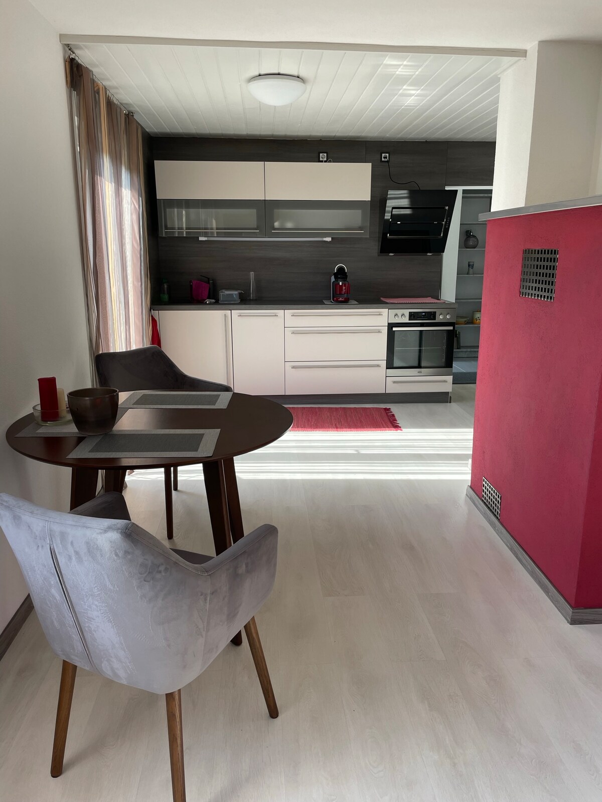 Bellissimo attico, arredato in modo luminoso, grandi finestre panoramiche, stufa in steatite per le giornate fredde, spazio per 4 persone, due camere da letto, due bagni (uno piccolo senza doccia, uno più grande, vedi foto) completamente attrezzati. Il supermercato è a soli 50 metri di distanza, in una posizione tranquilla. Collegamento diretto con piste ciclabili ed escursionistiche. Piscina a 250 metri. Parcheggio proprio davanti alla porta.