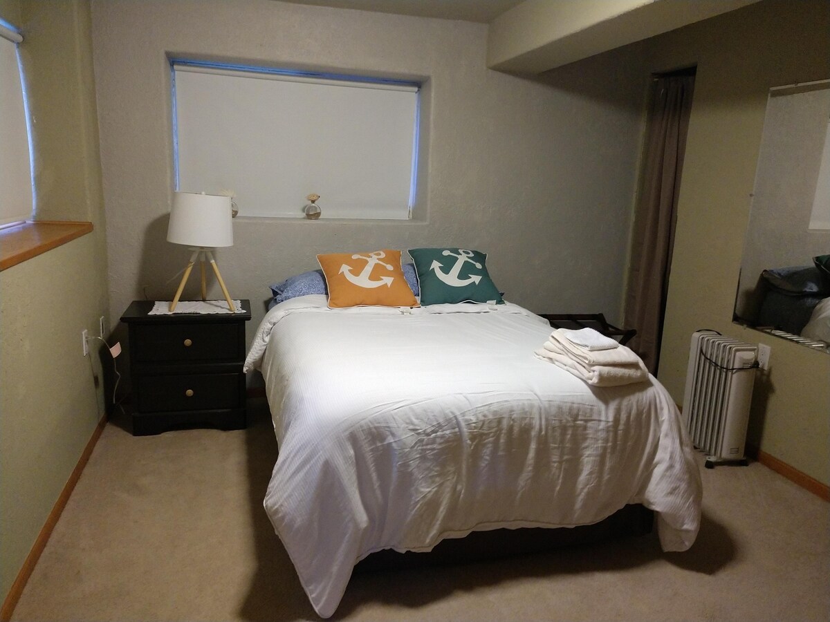 Suite privata est/ovest di 850 piedi quadrati, suite di 4 stanze in casa dell'host su due livelli - finestre in ogni stanza. Ingresso senza chiave della porta d'ingresso condivisa con il tuo host. Una volta all'interno dell'atrio, scendere 6 gradini fino alla porta d'ingresso della suite privata. Il soggiorno/seconda camera da letto ha un letto a due piazze e una tenda per la privacy. Un comodo materasso è disponibile quando 3 ospiti preferiscono sistemazioni separate. Scrivania dedicata situata nella camera da letto principale. A 1 isolato dalla linea dell'autobus. La tua privacy è sempre rispettata.