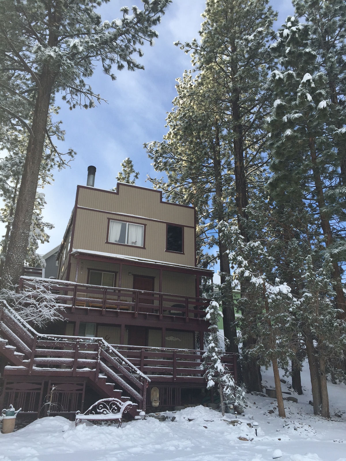 Immerso tra alti pini: questa è una montagna perfetta per allontanarsi! Vista panoramica sulle montagne a soli 2 isolati di distanza dalle escursioni nella foresta nazionale. Vasca idromassaggio, tre livelli di terrazze con barbecue e posti a sedere all'aperto. Caminetto in pietra, 2 TV a grande schermo, pavimenti in travertino, cucina completamente rifornita con doppio forno. 8 miglia da Snow Summit, a circa 10 minuti di auto. Proprietà appartata un tempo di proprietà di Mary Astor, attrice a schermo silenzioso (Falcon maltese).