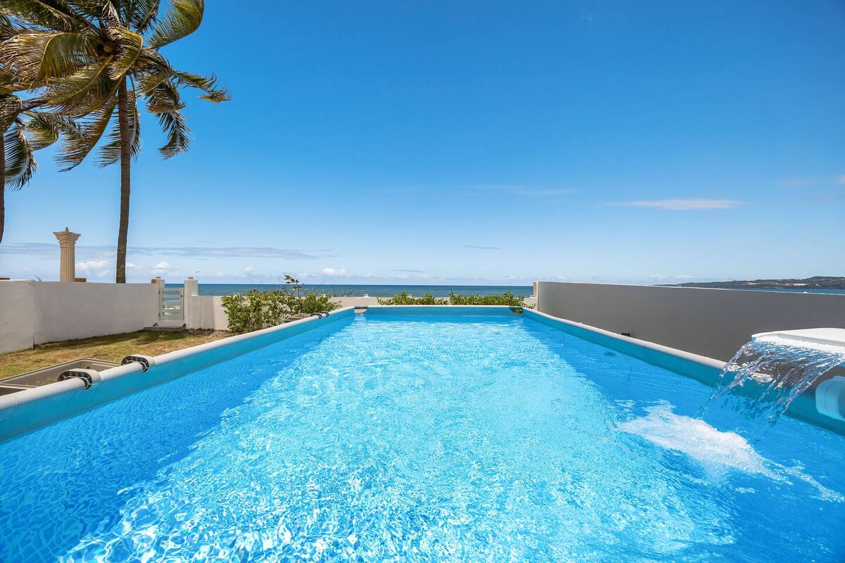 This airy, spacious beachfront home features a spacious private porch with large family style outdoor living with multiple comfy sofas and chairs. Featuring a extra large marble table which seats 16. Boasting multiple bedrooms, a full kitchen, and extra large pool deck with lounge chairs and grilling station, it’s perfect for families or groups seeking relaxed oceanfront living steps from the sand and sea. So many dining options in both Aguada and Aguadilla. Your perfect vacation awaits.