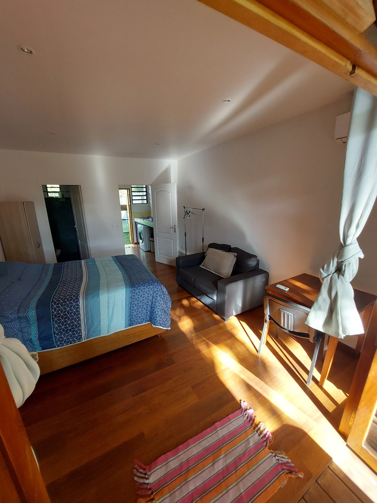 The Miti Suite faces the sea, and you will enjoy a beautiful view of a small harbourfront. The suite is located very close to the Moorea Ferry Terminal (5min walk), Technimarine for those who need to repair their sailboat for instance, and within walking distance to downtown Papeete. It has one air conditioned bedroom with a queen size bed. The living room is air conditioned as well. The bathroom has a washer/dryer for convenient laundry.